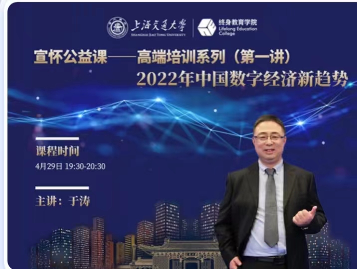 “疫”起學習,益啟人生!上海交通大學教育學院“ 宣懷公益”--高端培訓系列課程第一課!4月29日 今晚19:30—20:30,小鵝通直播間與您共修《2022年中國數字經濟新趨勢》:1、盤點中國數字經濟的階段性特征;2、展望十四五數字經濟發展與規劃;3、守住數字經濟安全監管底線;4、玩轉數字經濟新游戲!誠邀您在埋頭抗“疫”的時候,抬頭看看外面的世界,讓我們可以認準方向,共同逆勢向上!